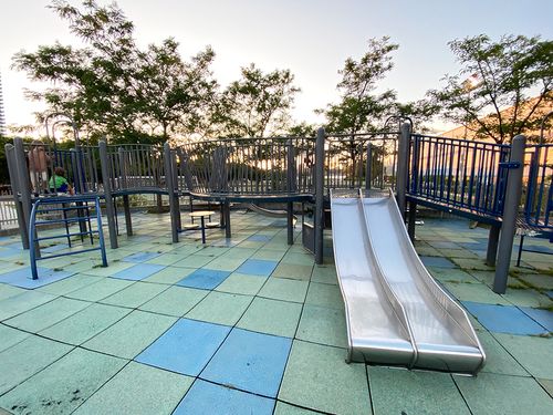 This toddler only playground overlooks the east river and the soccer field just below it.