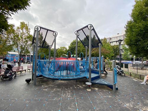 The first time we came to this playground, it was empty. We were there in the middle of a crisp November afternoon, which might explain why nobody else was there. It was quite a different scene on a warm September afternoon.