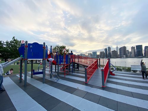 The Long Island City waterfront was once an industrial hub that has been transformed over the last several decades into a modern residential hub with a waterfront walkway along the East River. Hunter's Point is easily accessible by NYC Ferry, and not so easily accessible by 7 Train or walking over the Pulaski Bridge. This playground opened in 2013