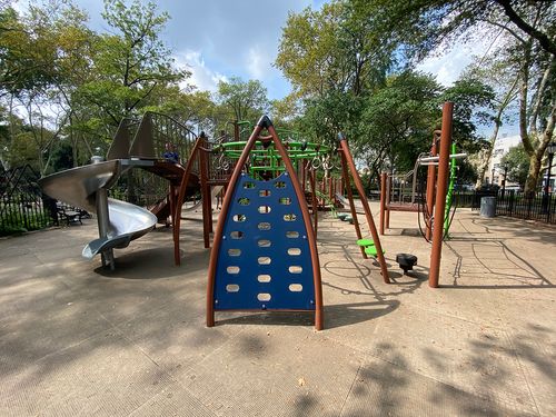 Very large playground with a few distinct areas. Swings, water, little kids, big ones - they’re separated but still feel interconnected. It gets very busy as it’s part of a pretty large park that boasts the only local Sunday Farmers’ Market, picnic tables, one million birthday parties, a dog run, and proximity to the Greenpoint Library (also open on Sundays). But the ability for kids to run between the sections gives it a nice flow and relieves crowding; there’s enough space for everyone.